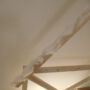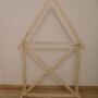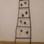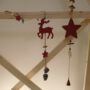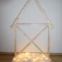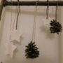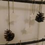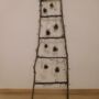Maak met de takken van de boom een ladder en maak de versiering vast. Ik heb gekozen voor dennenappels en witte sterren die ik uit boetseerklei geknutseld heb. Tot slot de lichtjes bevestigen en de ladder buiten plaatsen: